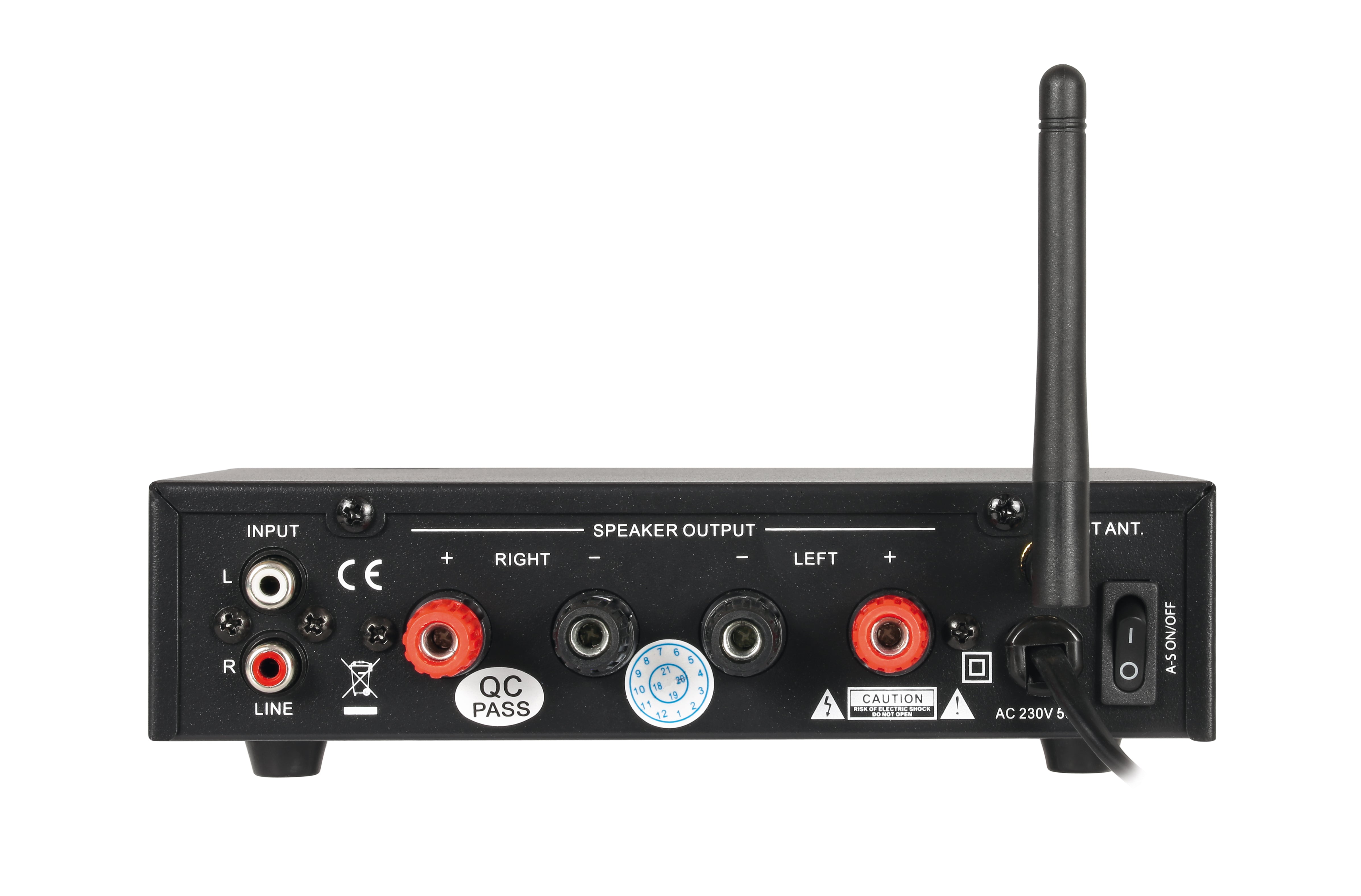 - Ingangen: 1 x line ingang via RCA, 1 x AUX ingang via 3,5 mm Jack