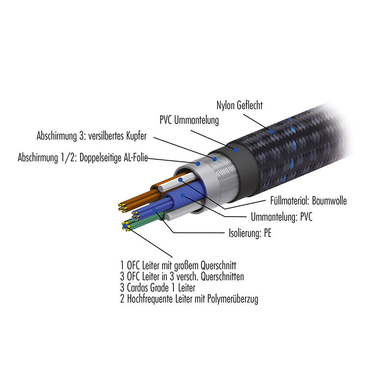 Hoogstroomkabel voor audiotoepassingen met een C19-connector. Bijzonder geschikt voor audioapparaten met een hoog vermogen (bijv. eindversterkers, meerkanaals- en geïntegreerde versterkers). De 7-AWG-constructie zorgt voor een geoptimaliseerde hoge stroomafgifte, terwijl de 7-polige multi-core doorsnede een optimale 50/60 Hz-stroomafgifte garandeert. 99,99% zuivere OFC-geleiders in combinatie met Cardas Grade 1 kopergeleiders zorgen voor een optimale geleiding. De geleiders zijn spiraalvormig gerangschikt voor interferentieonderdrukking. Drievoudige afscherming elimineert externe hoogfrequente interferentie. 24-karaats vergulde connectoren zorgen voor optimaal contact. Vergeleken met de standaardversie heeft de SE-versie een complexer ontwerp per geleider en is de afscherming van nog hogere kwaliteit. Gedetailleerde informatie is te vinden in het doorsnedediagram.